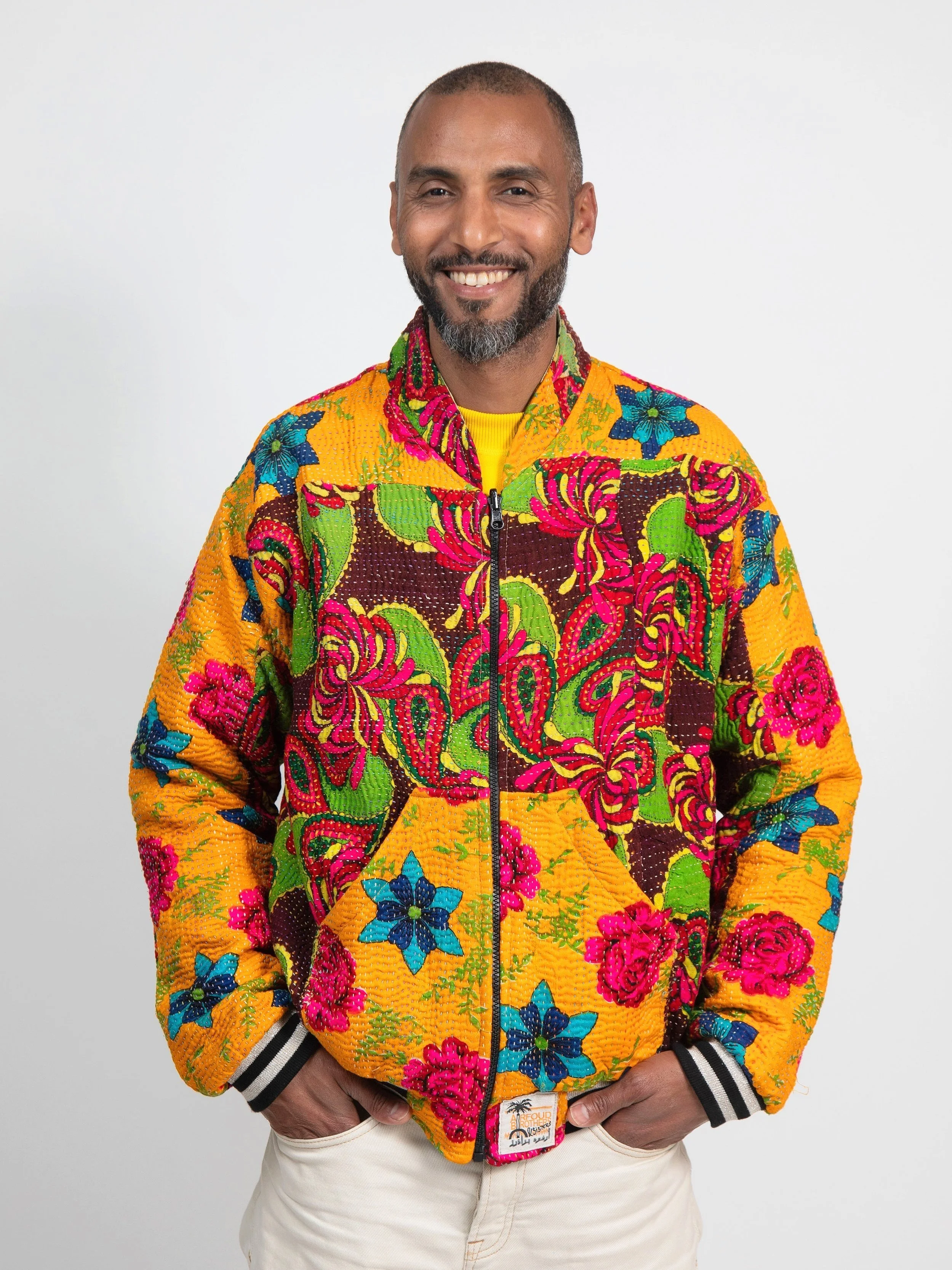 Handcrafted by our tailor in Arfoud, these unique bomber jackets are made from Kanta, a recycled textile typical from Pakistan made from layering 2 to 7 layers of cotton or silk & fixing it by doing rows of running stitch by hand.